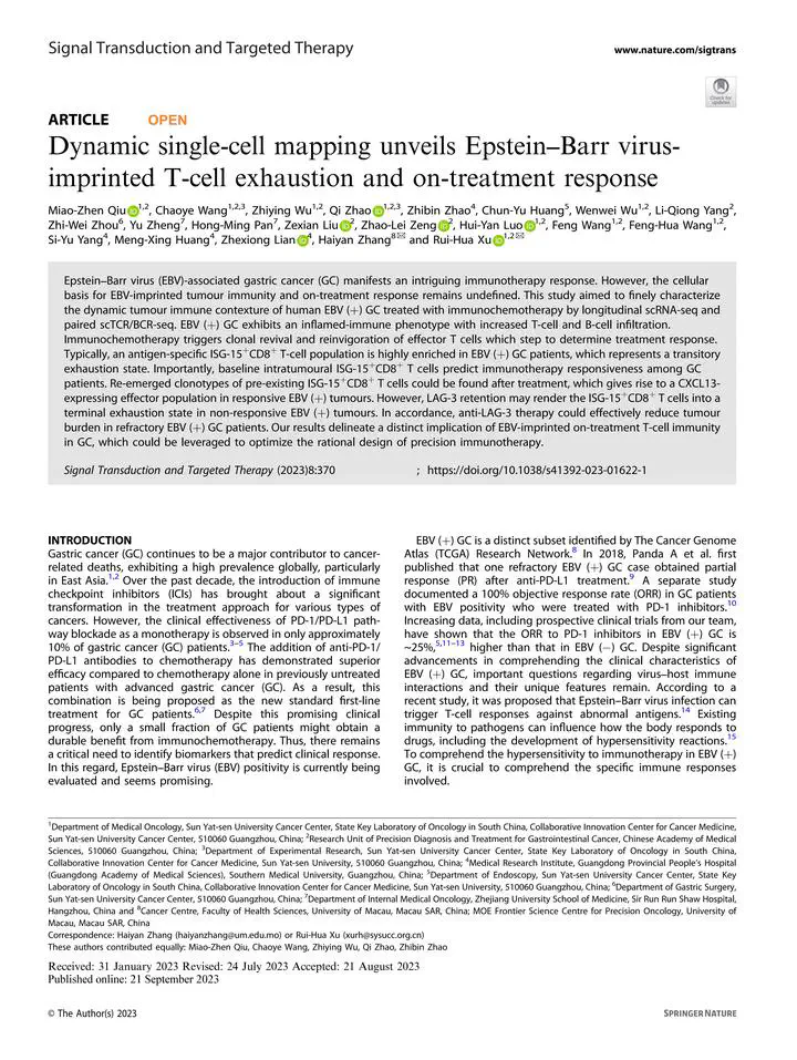 “Our study on the single-cell dynamic microenvironment of EBV-positive gastric cancer before and after anti-PD1 treatment” is now published in Signal Transduction and Targeted Therapy. link